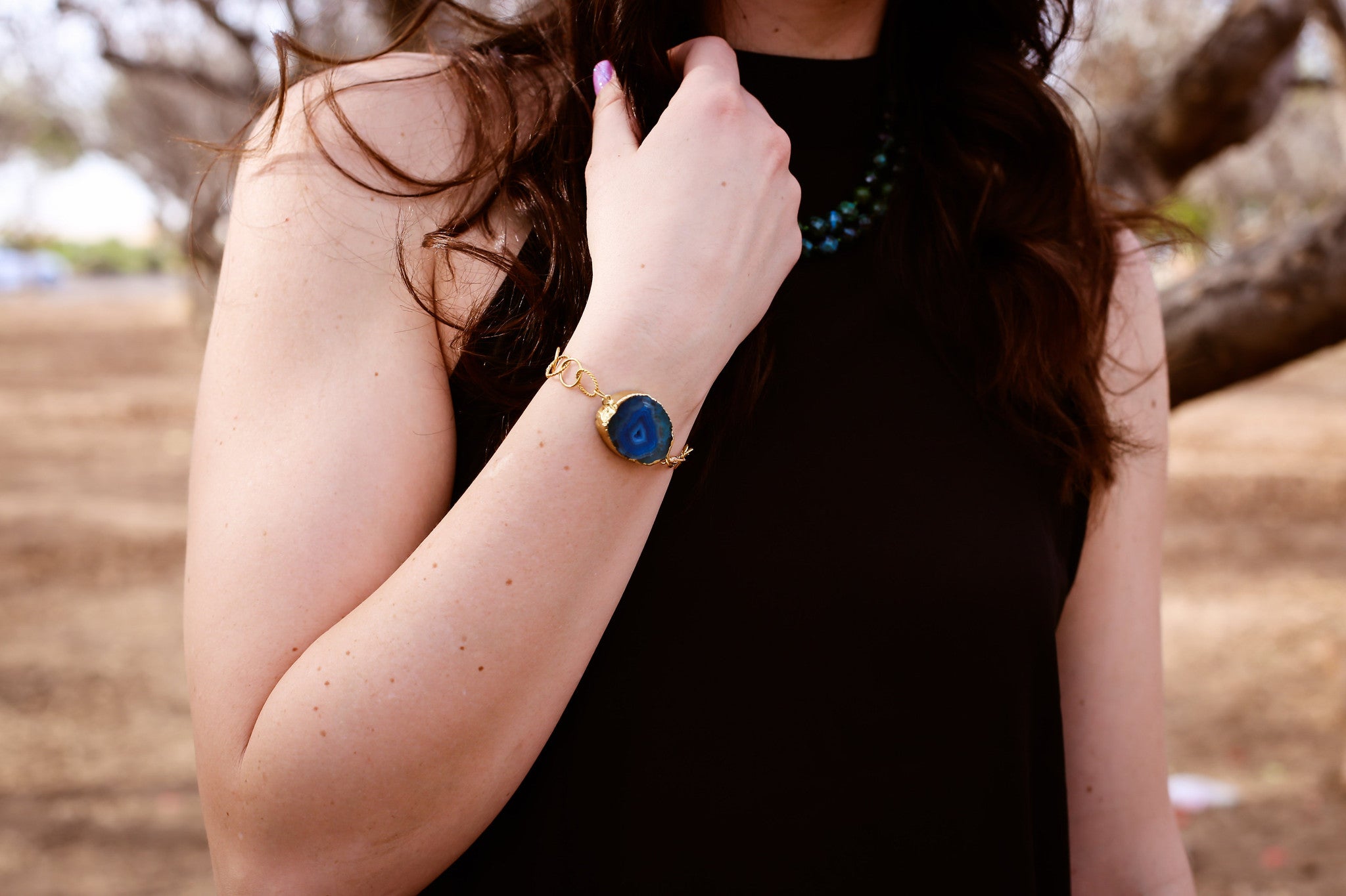 Look crystal clear with a bright blue gold dipped solar quartz is embraced with 14k gold plated ring chain.