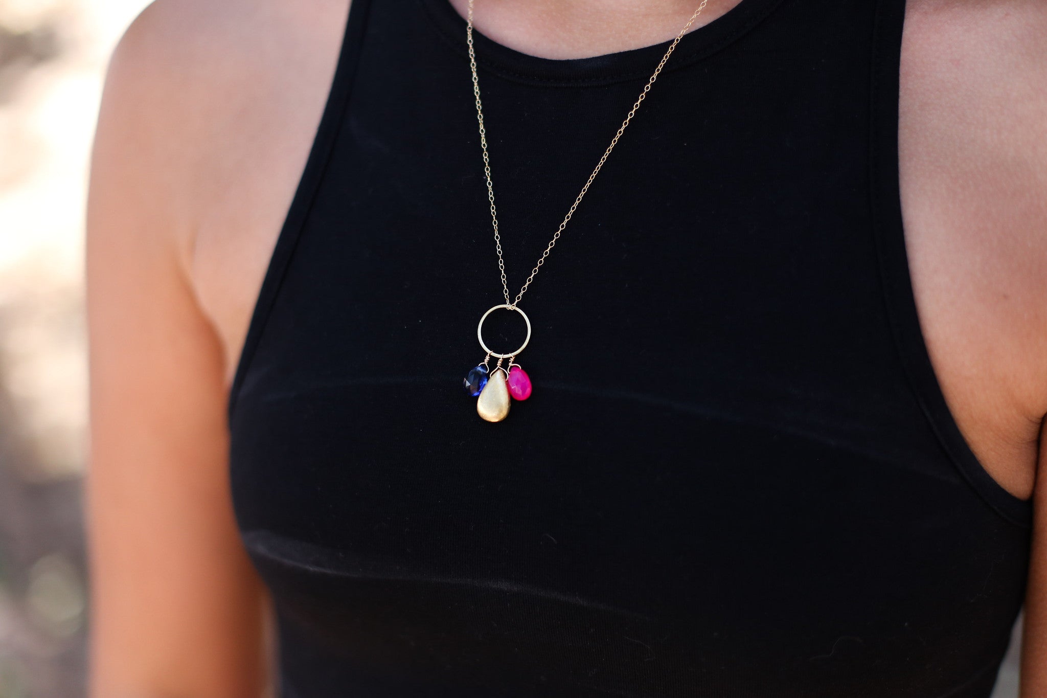 Bright, bold gemstone pendant necklaces to brighten your look! I've paired each unique gemstone pendant with colorful accent beads. Each bead is hand wired and the cluster of gemstones hangs from a matte gold circle link. The pendants dangle from a 14k gold filled round cable chain.