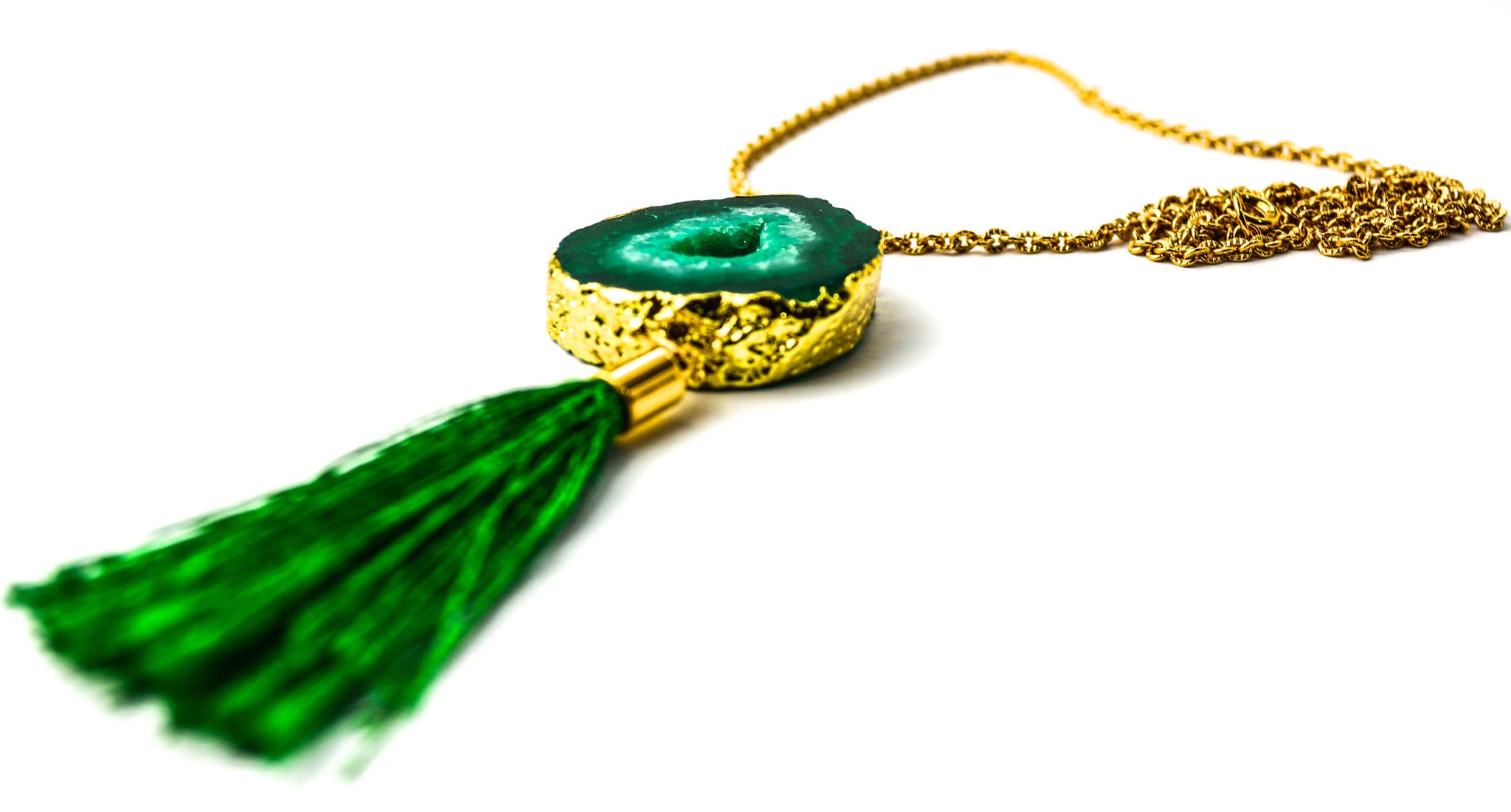 A dark green gold dipped solar quartz with a silk tag for that outstanding look. Chain is 14k gold plated with gold plated clasp.